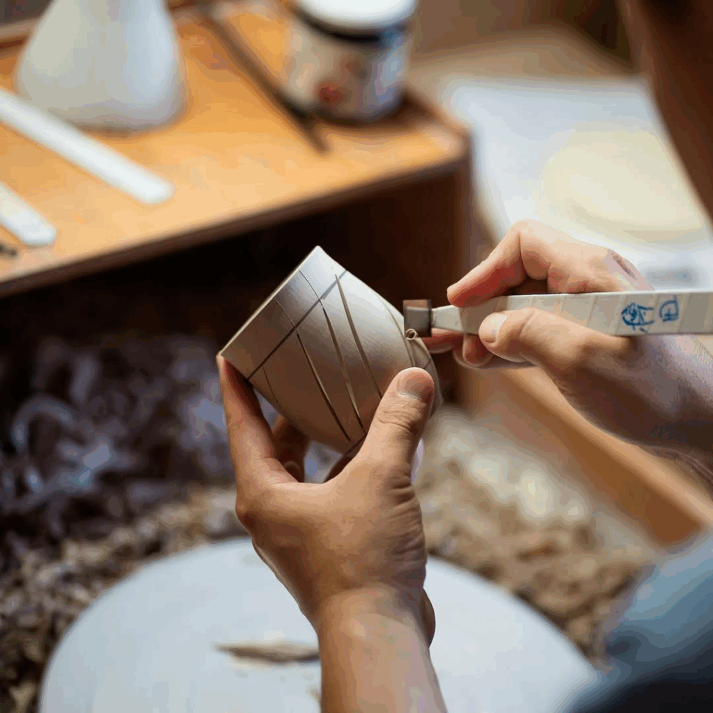 彼の器に刻まれた線と、そこから透ける光は、日常にある移ろいゆく光を美しく捉え、持つ人の時間に寄り添ってくれます。