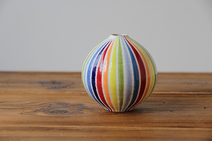「きれいな色を出すため、通常より低い温度で焼き上げる。釉薬に適した温度があるんです」と語るように、色合い、色調、フォルム、そして焼成温度に至るまで、徹底的にこだわります。