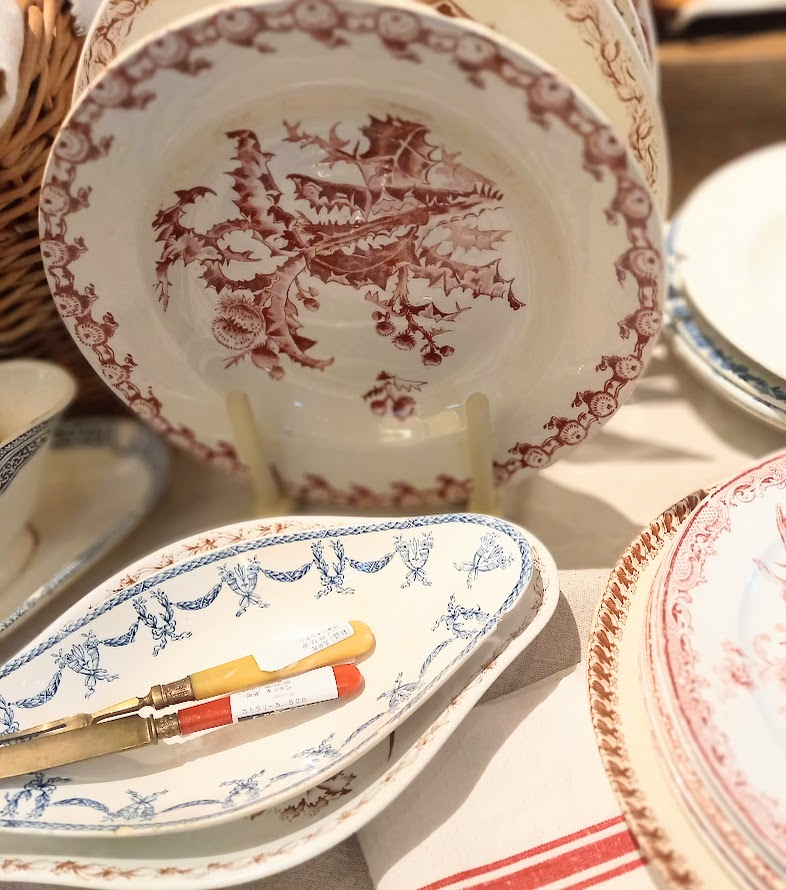 19世紀から20世紀前半のイギリスやベルギーなどのプレート、美しいカップ&ソーサーなどが並びます。