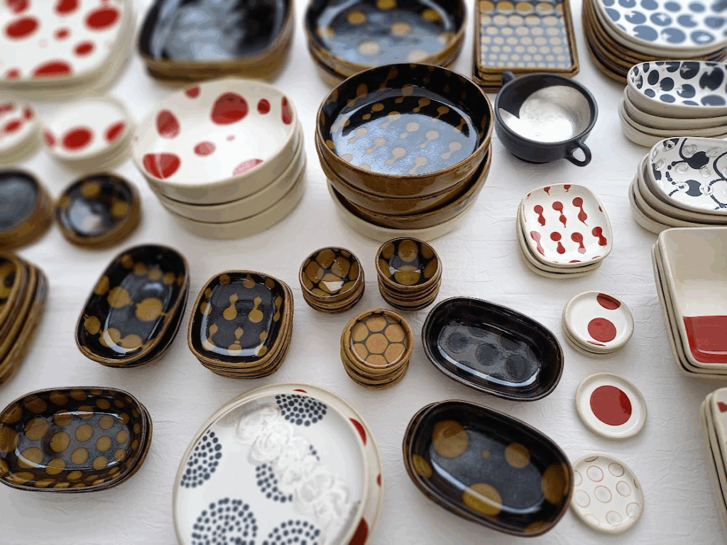 スリップウェアによる多様な作品が並ぶ芦澤さんのブース。さまざまなタイプの水玉模様のうつわは、見ているだけで元気になります。テーブルのアクセントに欲しくなりますね。