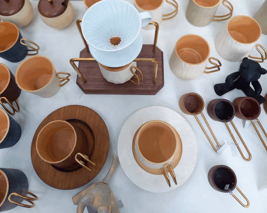 木製のカップに金属の持ち手を組み合わせた、ナチュラルかつスタイリッシュなマグカップやドリッパーが気になりました。表面に手彫りによるレリーフがあることで、手仕事のぬくもりを感じます。
