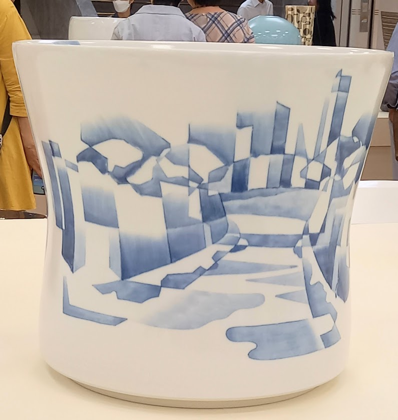 川の向こうにビルが並んでいる光景を染付で表現。今の時代らしい作品ですね。