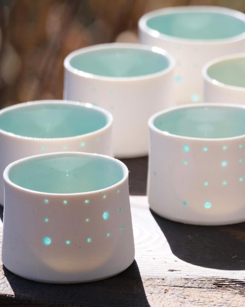 これは、素焼きの器に小さな穴を開け、その上から釉薬をかけて焼き締めることで、光を透かす半透明の模様が浮かび上がります。この神秘的な模様は、まるでホタルが放つ淡い光のようにも見えます。