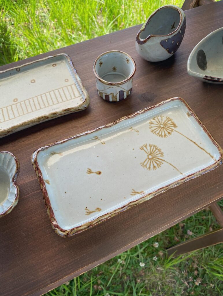 彼女が生み出す器は、シンプルな線で描かれたモチーフが特徴です。