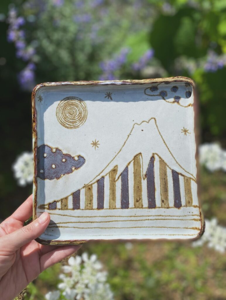 器に描かれるモチーフは、工房から見える富士山や、四季折々の花や植物、風になびく草など、身近な風景からインスピレーションを得ています。