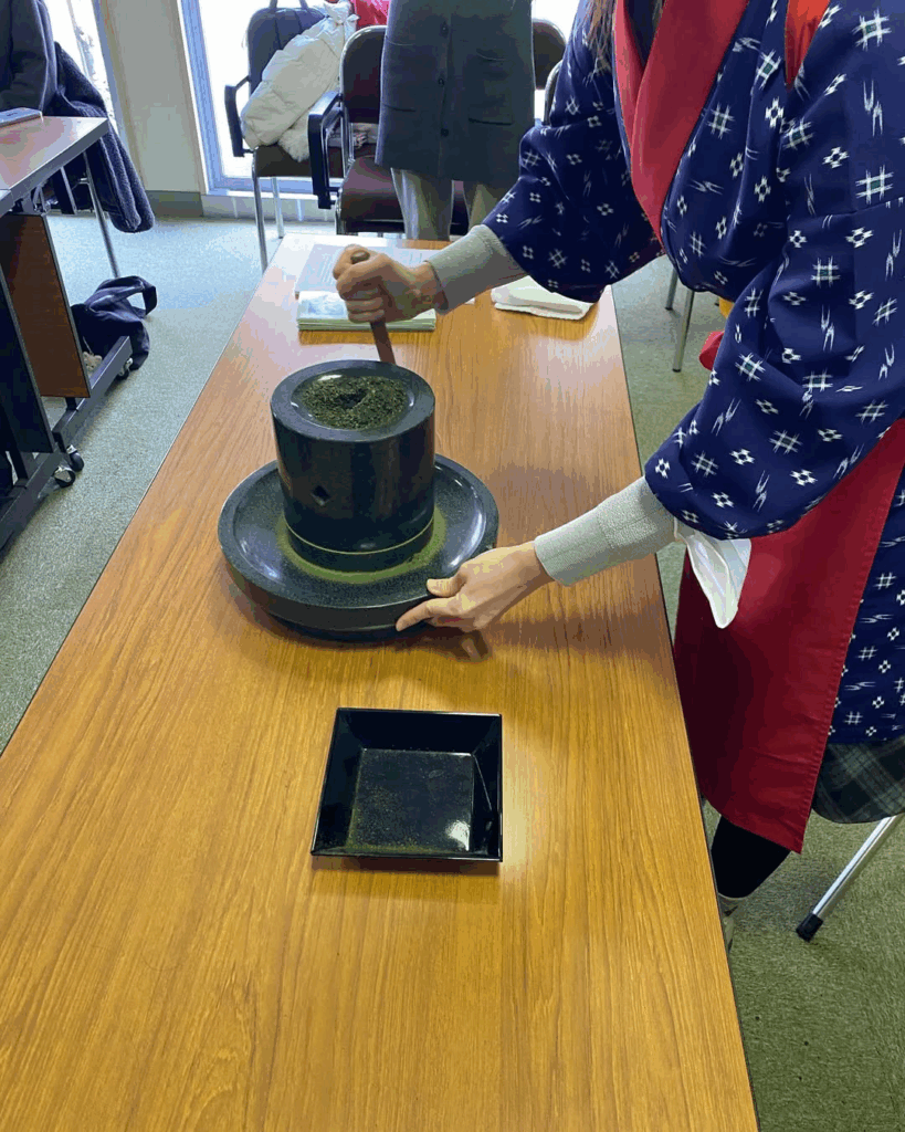 また、「お抹茶体験」では、茶臼で抹茶をひくところから始まり、抹茶アートにも挑戦できます。