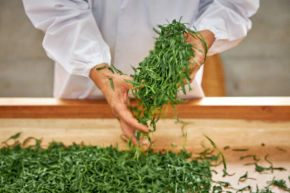 手もみ茶には、収穫の二週間前に被覆した玉露の最上級の一番茶、それも手摘みした「一芯二葉」のみが使われます。