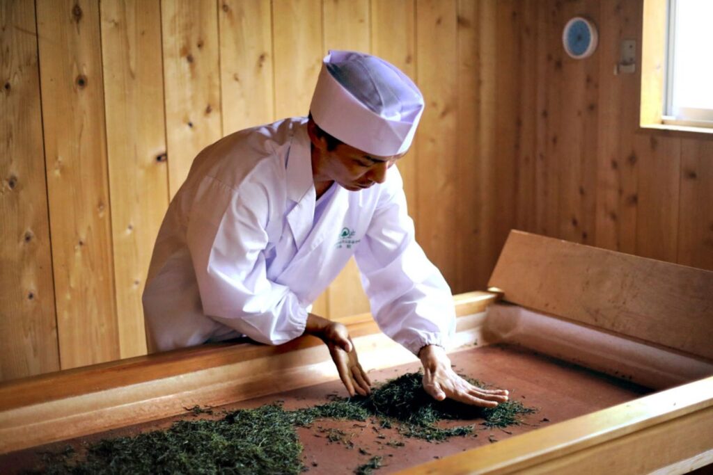 その工程はまるで、茶葉に命を吹き込む芸術のよう。焙炉(ほいろ)の上で、蒸された茶葉が湯気をあげながら比留間さんの手によって舞い、徐々に水分を失っていく姿は、息をのむほどに美しく、神秘的です。