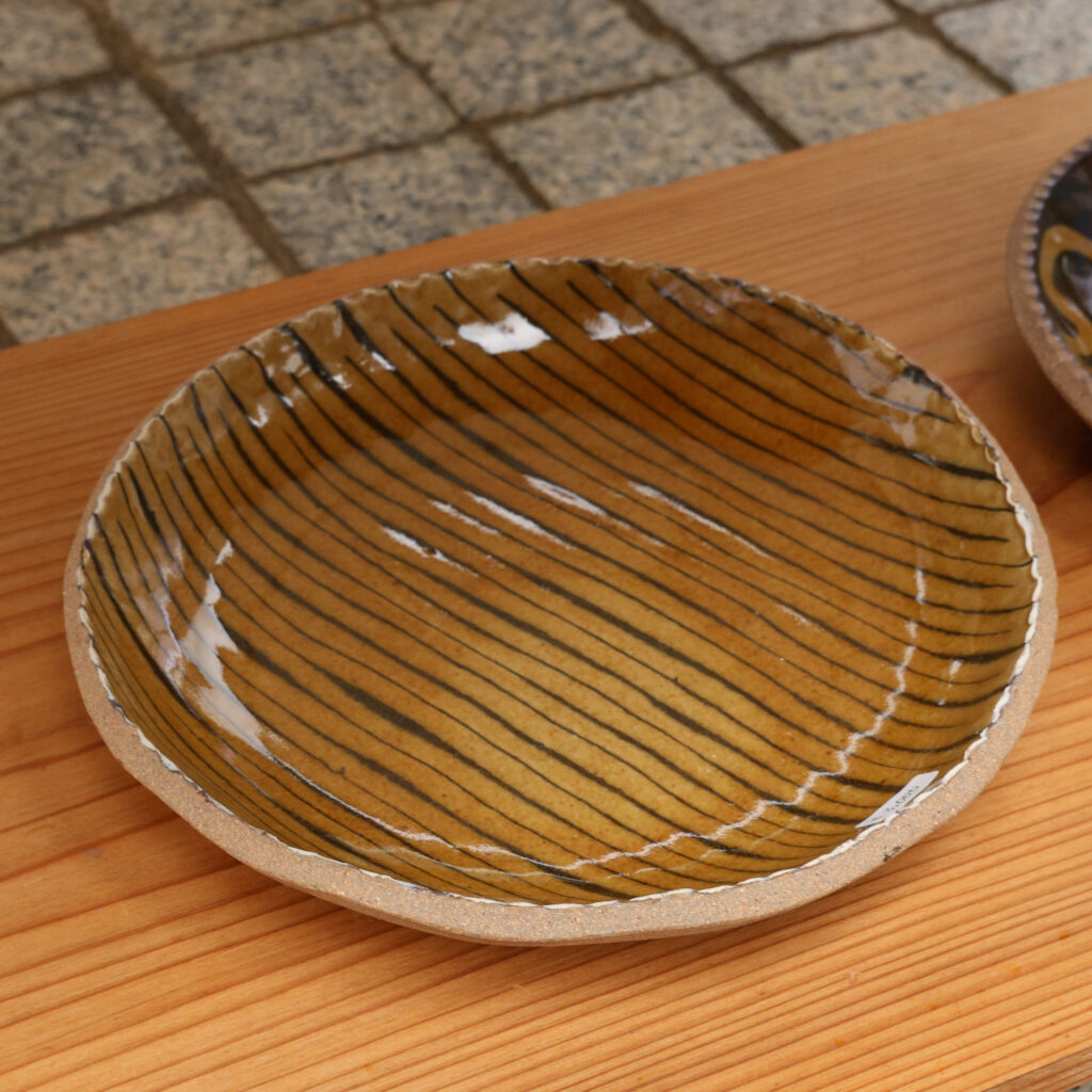 深い飴色や素朴な土の色を基調とした器に、流れるような曲線や、規則正しいストライプが描かれています。